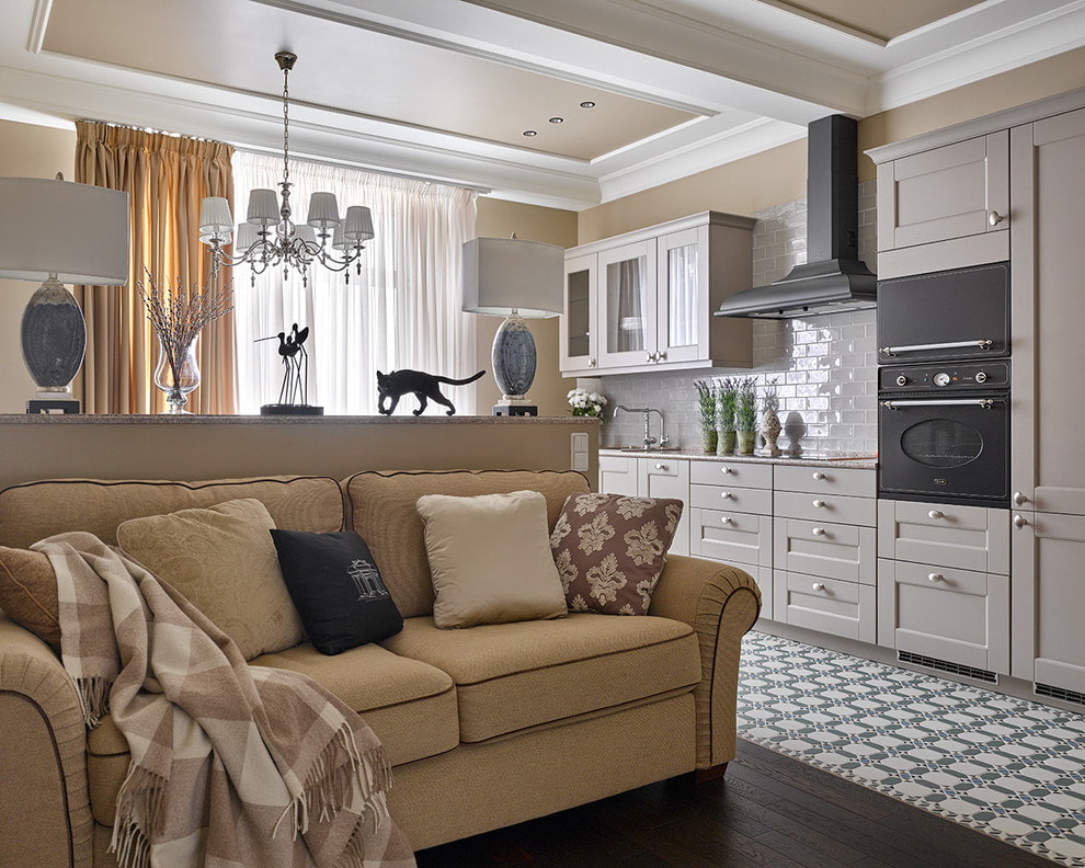 In the classic design, beige, cream shades are often used. The interior is executed in restrained colors, focusing on natural materials and elegant filling of the room.