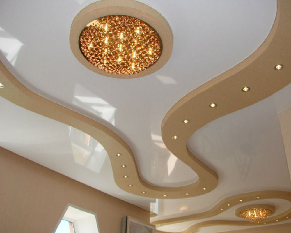 A more complex design looks good in a modern interior. This type of design is desirable for use in spacious rooms. A multi-level ceiling is appropriate for a living room or bedroom.