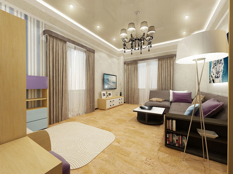 With the help of beige, you can experiment with the interior of the room and decorate the ceiling in an original way.Below are photos of a beige ceiling in rooms for various functional purposes.