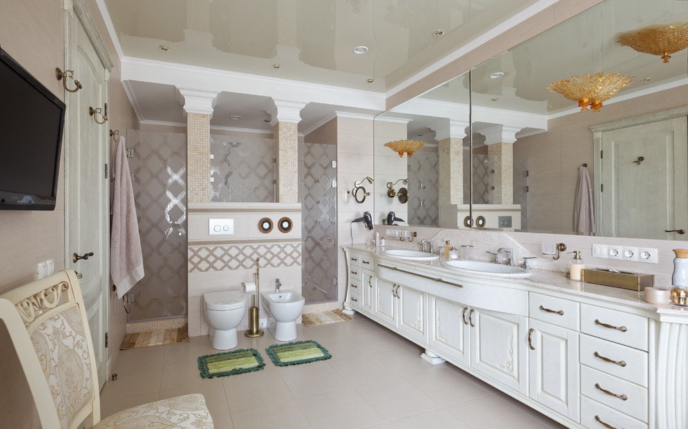 In the bath, it is better to use a rack-and-pinion structure made of metal panels, this will help to avoid the problem of fungus.The beige color will look harmoniously with several spotlights.