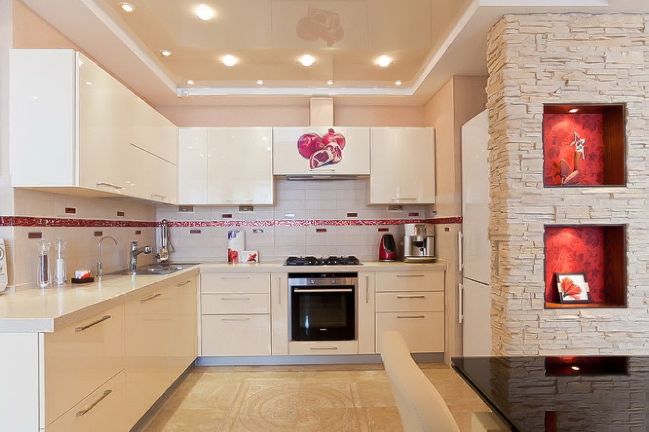 In city apartments, kitchens often have a small area, so in order to save space, it is worth using a light palette for decoration. The optimal color is white or beige. Glossy surfaces will help to achieve an increase in area due to a mirror effect.