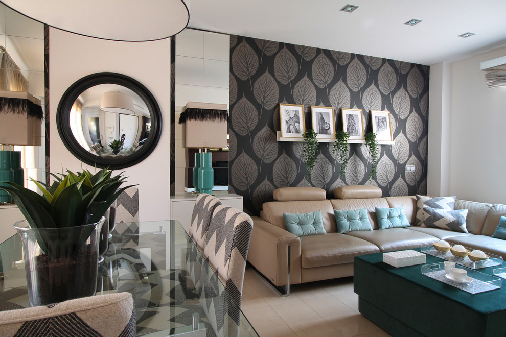 On the picture a modern interior in which black wallpaper with a pattern in the form of leaves, furniture in beige shades and accents of a delicate turquoise color are harmoniously used.