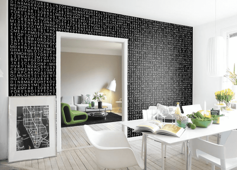 The final character of the interior design can be achieved by using the lettering on the wallpaper. A florid font with monograms and curls will look better in an apartment with classic decoration. Straight laconic letters will give the atmosphere brutality, severity, and fit better into the male interior.