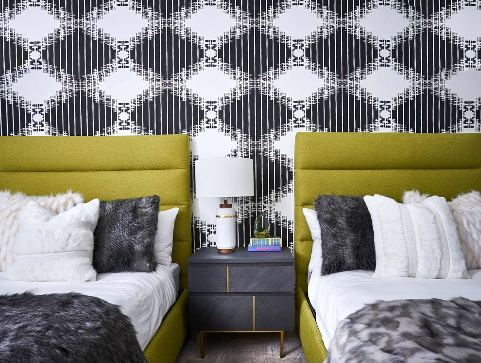 On the picture compact bedroom with black wallpaper in a small geometric pattern.