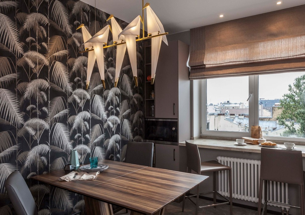 For a calm kitchen interior, it is better to choose wallpaper with a pattern or floral ornament in beige, golden, gray or pastel shades. A deep black with a glossy sheen is perfect for a minimalist and uncluttered design.