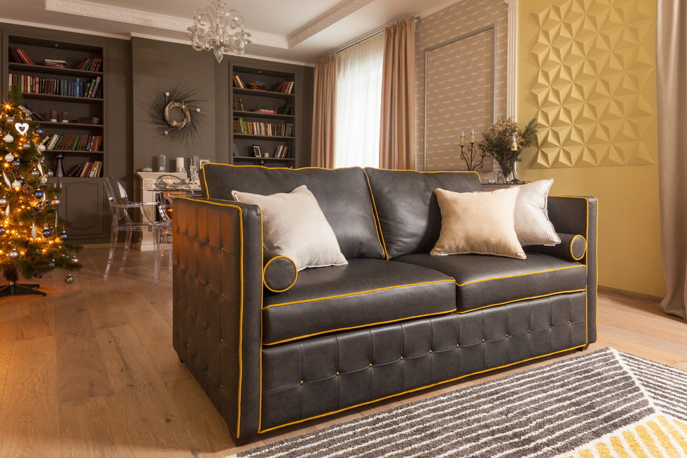 A black sofa with gold is a symbol of splendor and splendor; it is a frequent guest in classic and oriental styles. It is more appropriate to decorate it with small gold inserts so as not to overload the upholstery with shiny material.