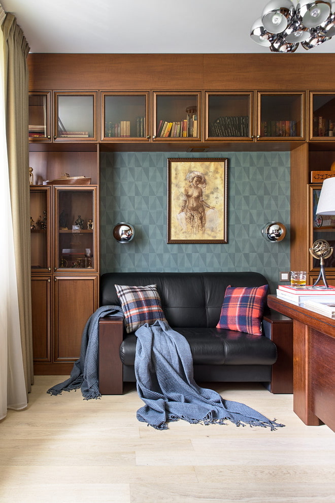 - Leather. Such a sofa always looks presentable and modern. Furniture covered with leather is not afraid of prolonged stress, but requires constant care. Suitable for offices.
