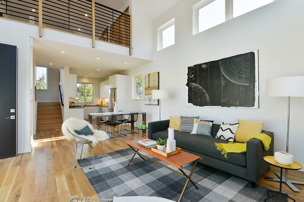 Models with thin white stitching look interesting and expensive in the interior. Monochrome striped or checkered furniture looks original. Sofas with chrome legs give the impression of weightless, sophisticated furniture.