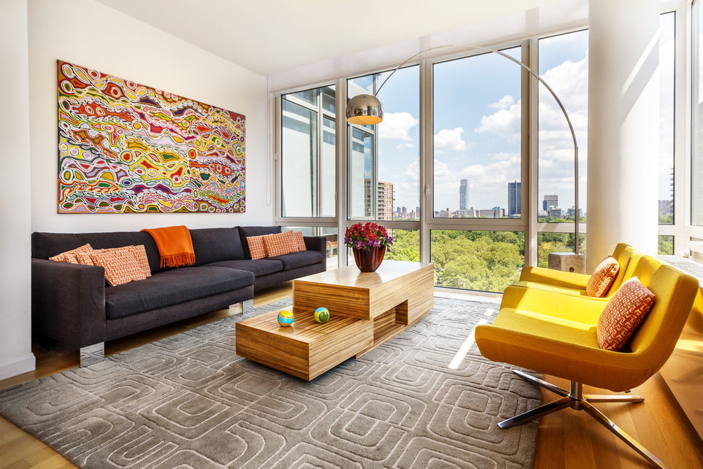 - Carpets. A constant companion of upholstered furniture, it brings its share of comfort and color. An unusual solution would be to use a carpet of saturated colors: red, yellow, blue.