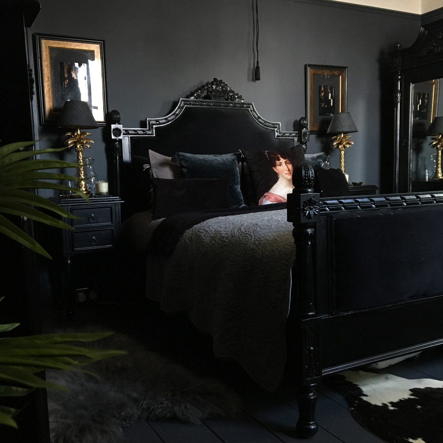 Pictured is a monochrome dark bedroom