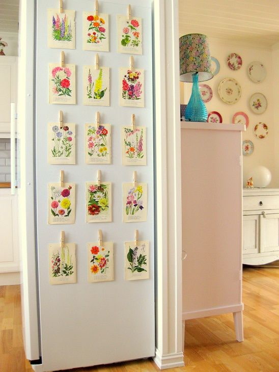 Another DIY decor idea: secure wooden clothespins with liquid nails. Hang up stylish postcards, baby drawings, or prints. Decorations can be changed daily.