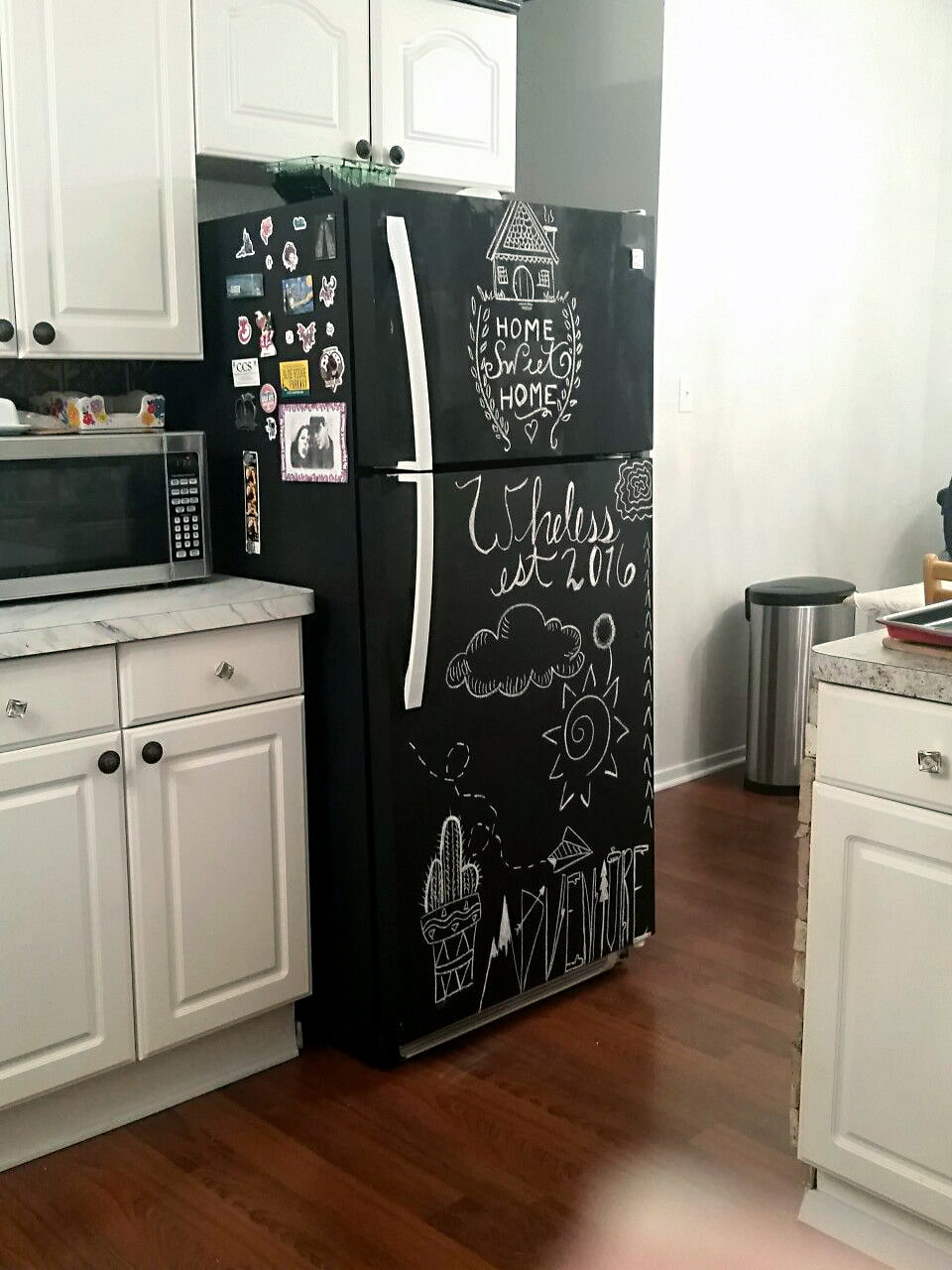 For those who are not afraid of experiments, black (or colored) slate paint is suitable. The design of such a refrigerator can be changed at will, drawing patterns, images and leaving notes.