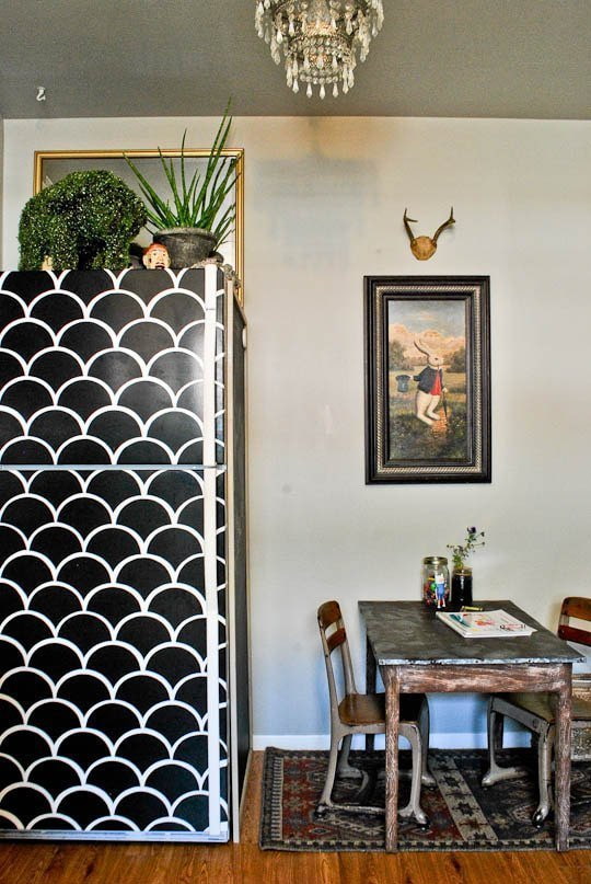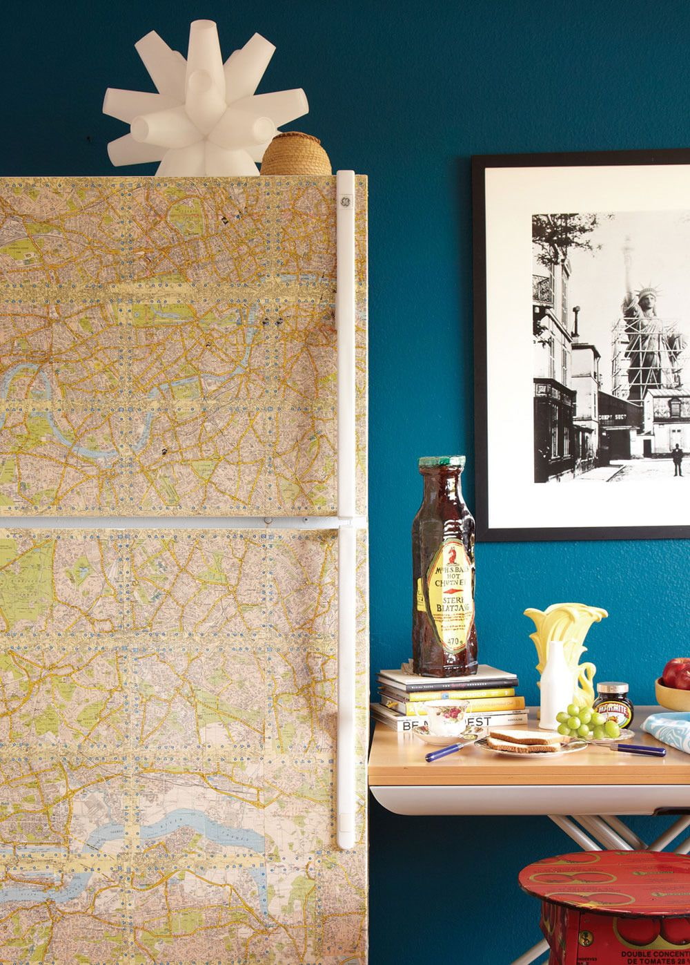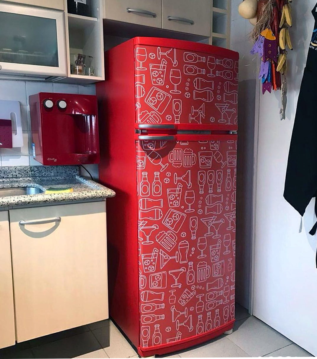 In order to completely transform the refrigerator, you can change its color using paint for metal or a strong chalk composition. The bright coating will make it more noticeable, turning it into the main accent of the interior.