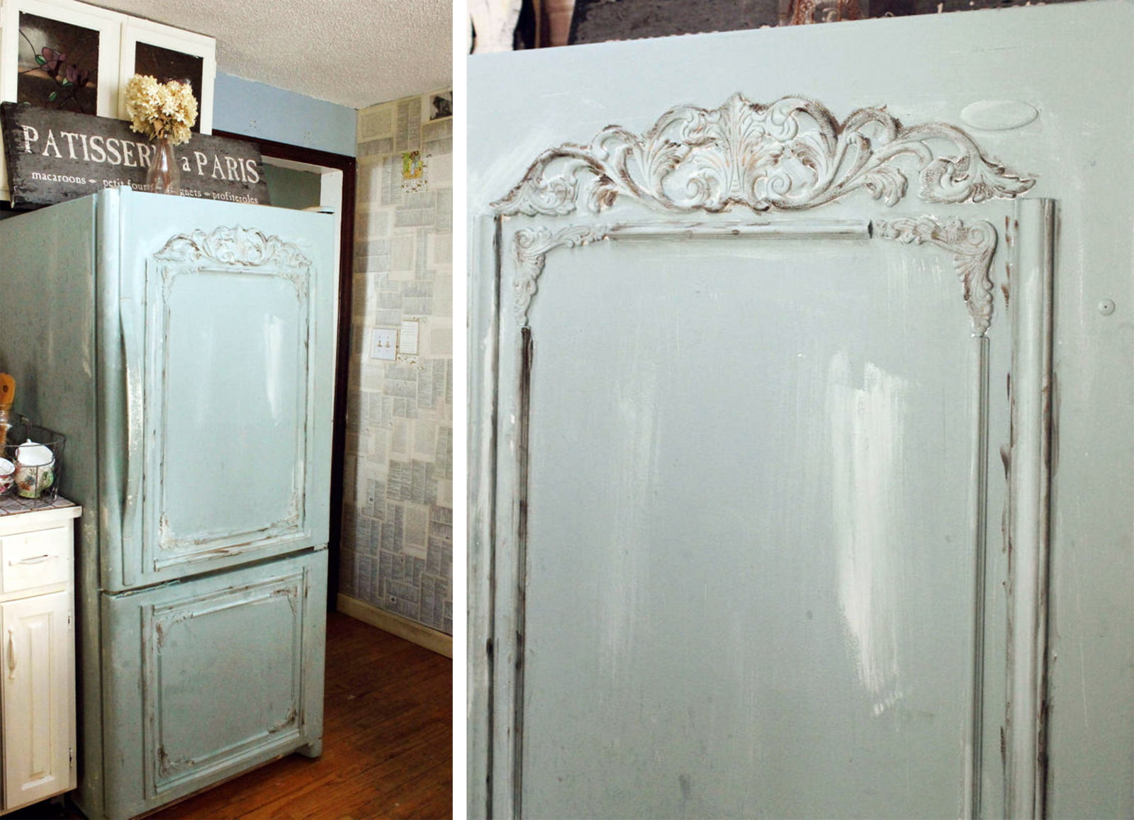The photo shows a decorated refrigerator that fits perfectly into the shabby chic style.