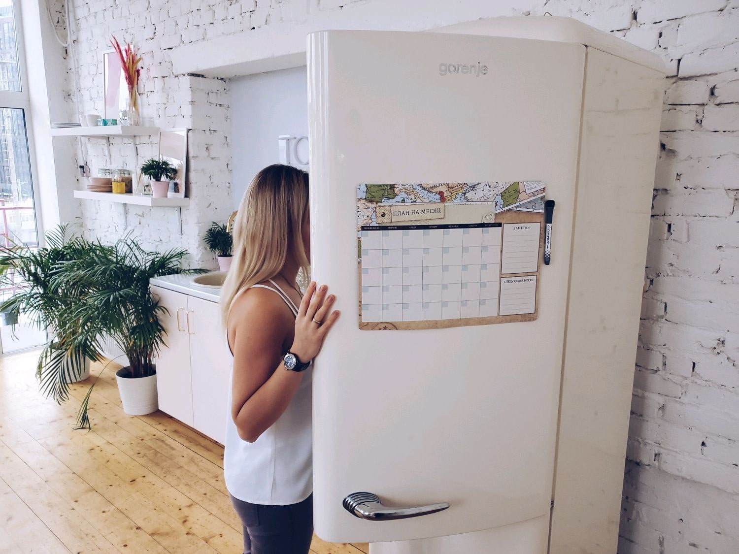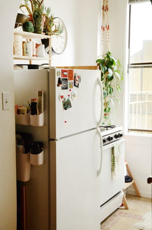 The refrigerator can become even more ergonomic if you use its sides and fronts for storing small items. It is easy to find on sale a variety of pockets with magnets and shelves with reliable fasteners.It is appropriate to place a notepad, calendar or planner on the door.