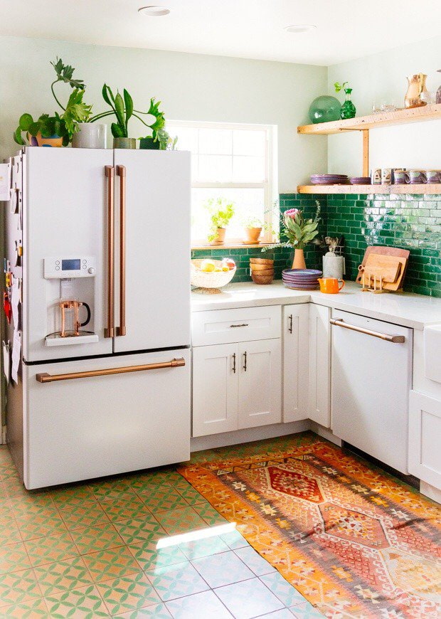 On the picture white kitchen with bright green accents in a tropical style. The refrigerator fits into the design thanks to the white color, as well as the plants and fruits located on it.