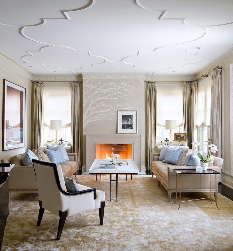 Moldings can accentuate the arrangement of furniture and lighting in a room.