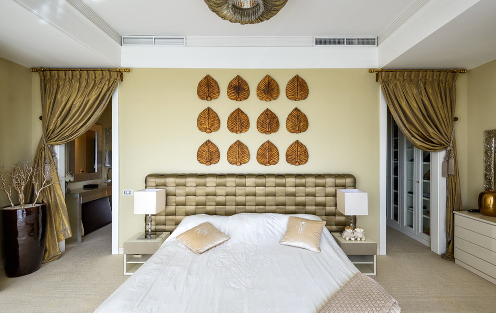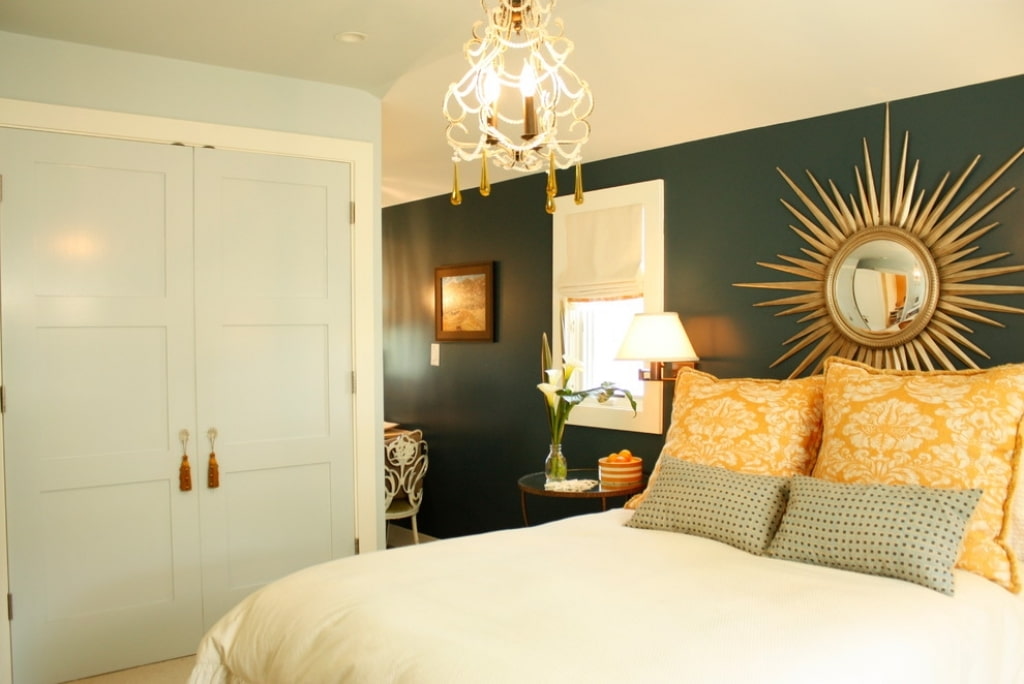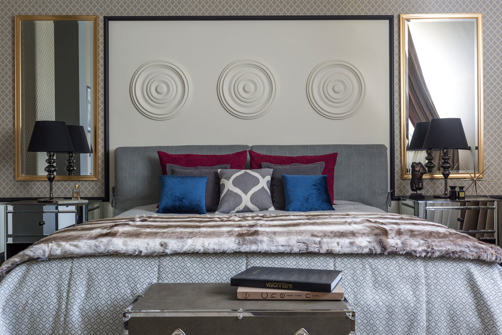 Pictured is an art deco bedroom with a sun-shaped decorative element on the wall.