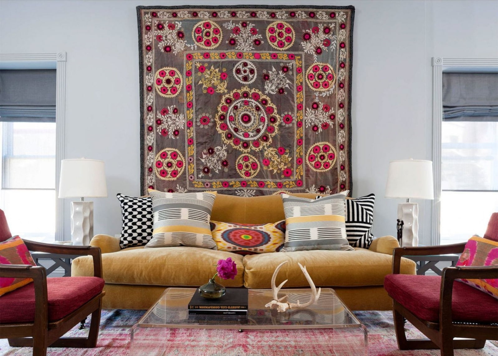 The photo shows a bright tapestry patterned carpet on the wall in the bedroom interior.