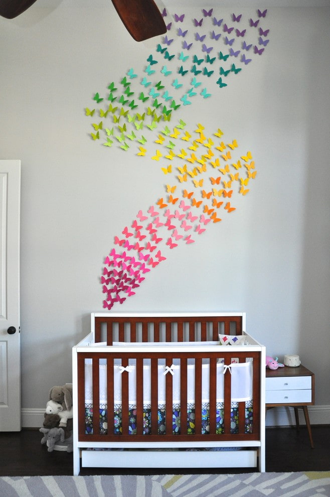 Butterflies, flowers, unusual garlands, volumetric stars or other hand-made paper products are a fairly popular and simple way to quickly transform a space and effectively decorate walls.