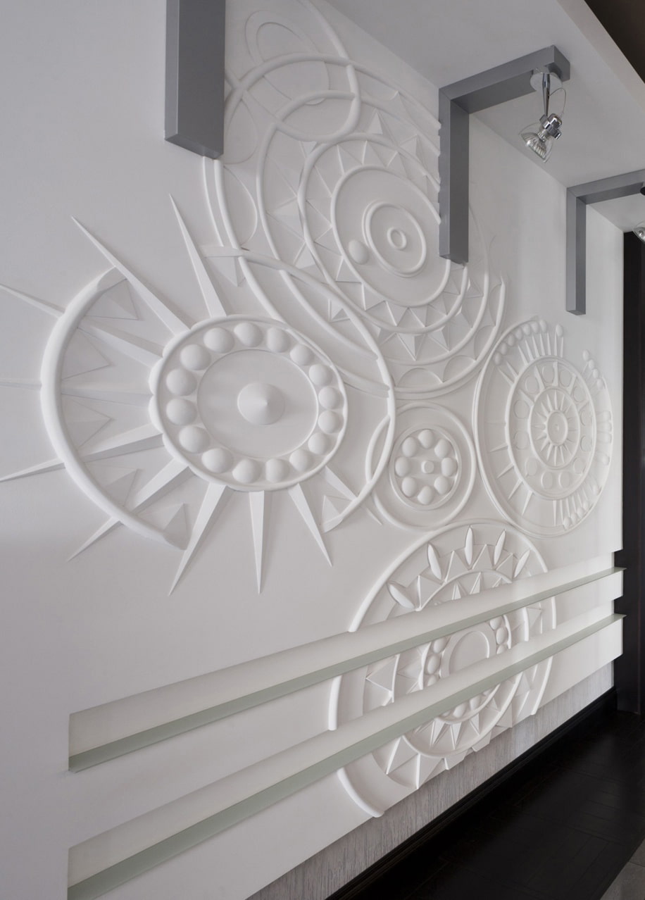 Overhead wall panels with embossed patterns add visual dimension to the room and create unusual visual effects in it.
