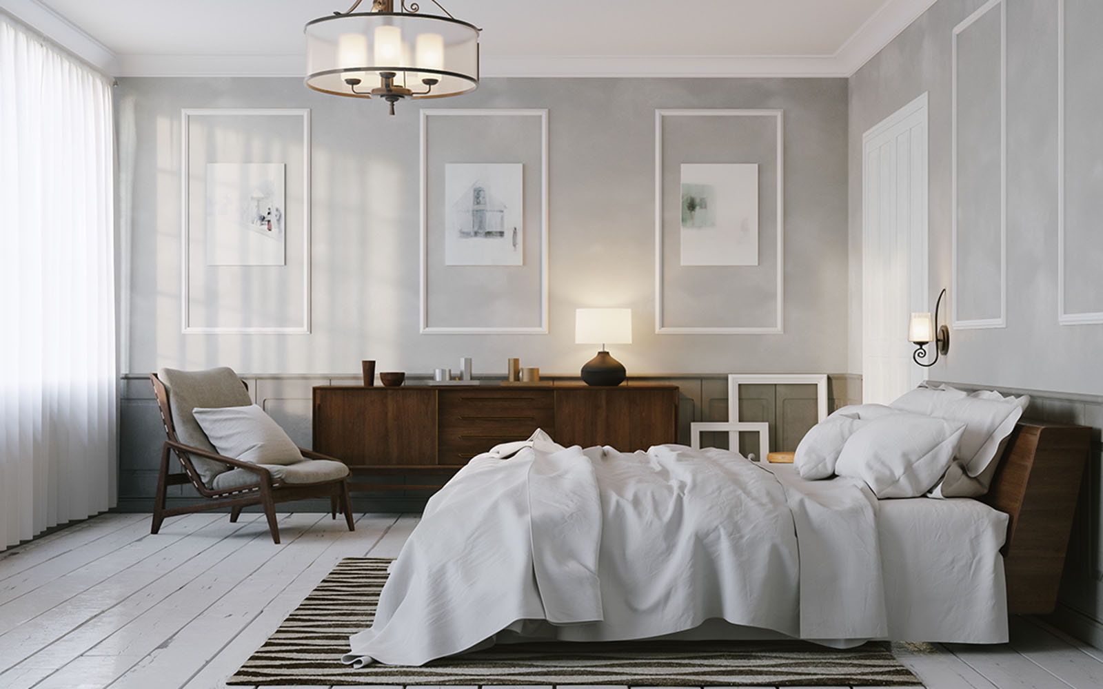 In the bedroom, wall decorations should not be variegated, as this will disturb the atmosphere of calm and relaxation. Not too shiny decorative elements in pastel colors or wood products are perfect here. The area above the bed can be decorated with paintings with calm, less emotional stories, photographs or wall sconces.