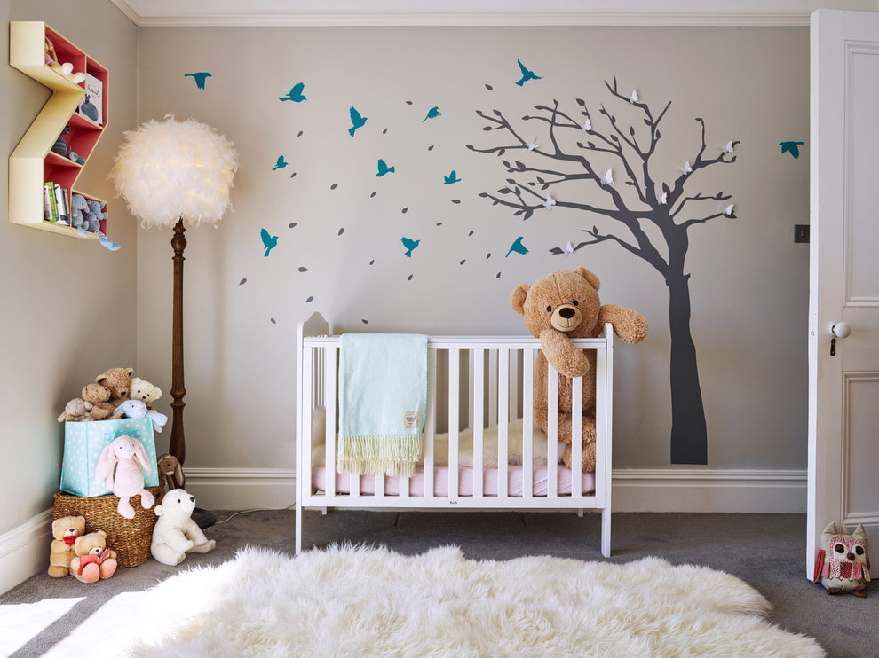 In the photo there is a room for a girl with paper decor in the form of butterflies on the wall.