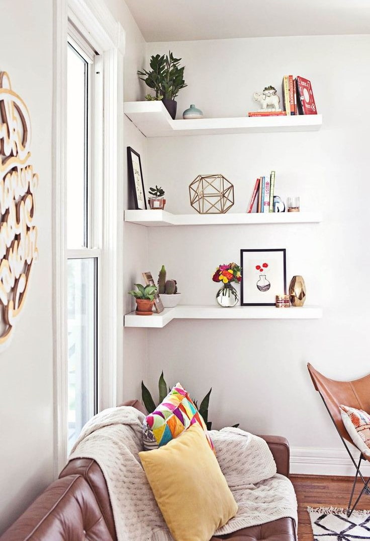 Corner shelves with books, photographs or various little things on them will create a unified and comfortable composition. You can also use your imagination to decorate the corner and come up with many other more original options.