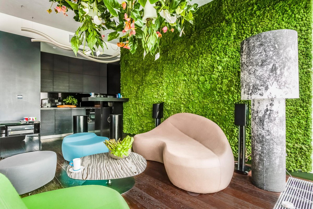 The wall, decorated with natural moss, is easy to maintain, pleasant to the touch and has excellent sound-absorbing qualities. Such aesthetically attractive and environmentally friendly phytodesign brings variety and freshness to the atmosphere.