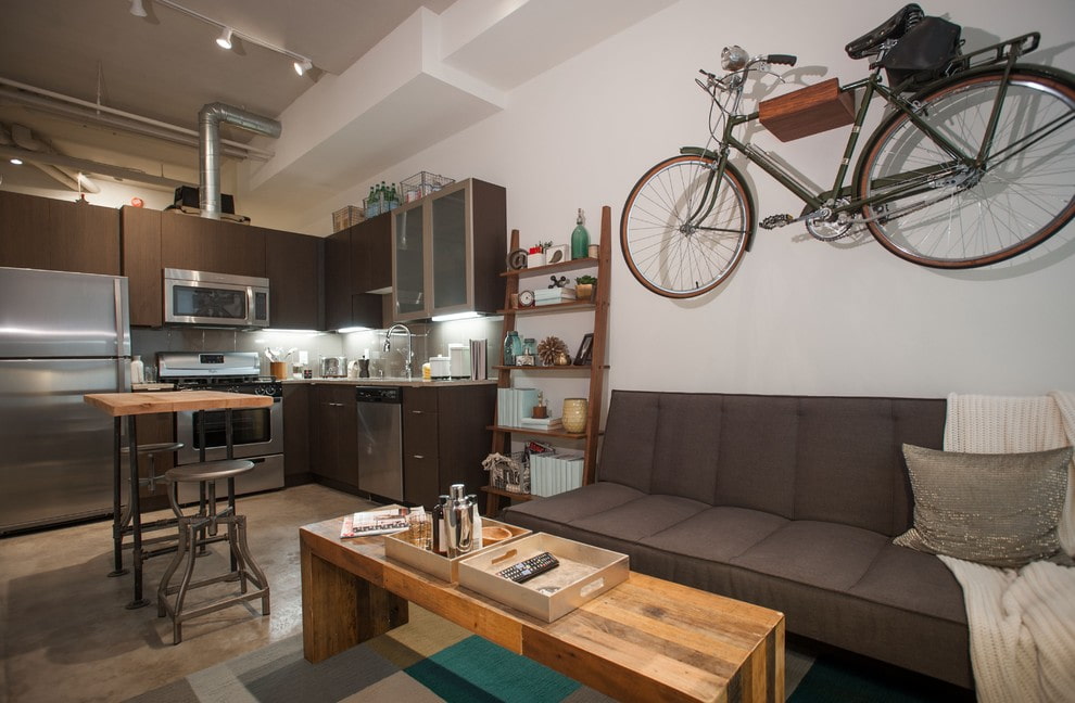 The photo shows a retro bicycle located on a white wall above the sofa in the interior of the kitchen-living room.