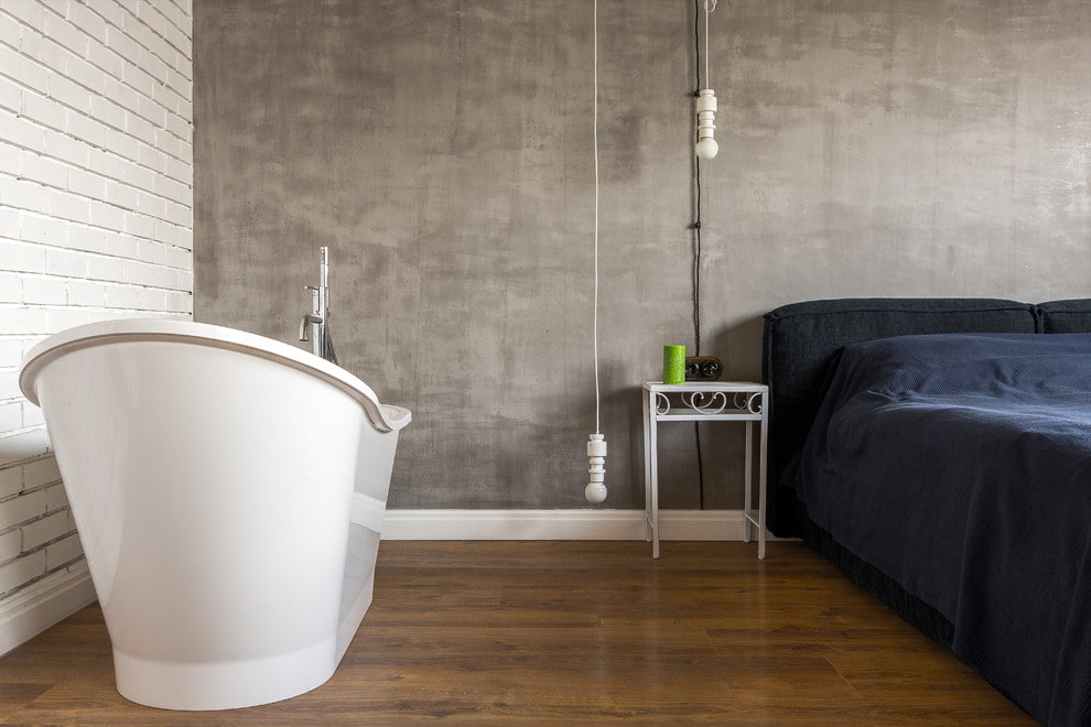 The photo shows decorative dark gray plaster on the wall in the bedroom, made in the style of minimalism.