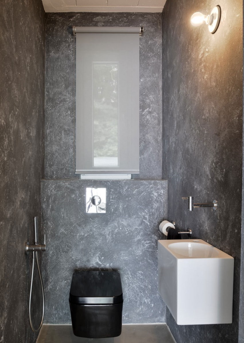 In the photo there is a bathroom with walls decorated with plaster with imitation of black marble.