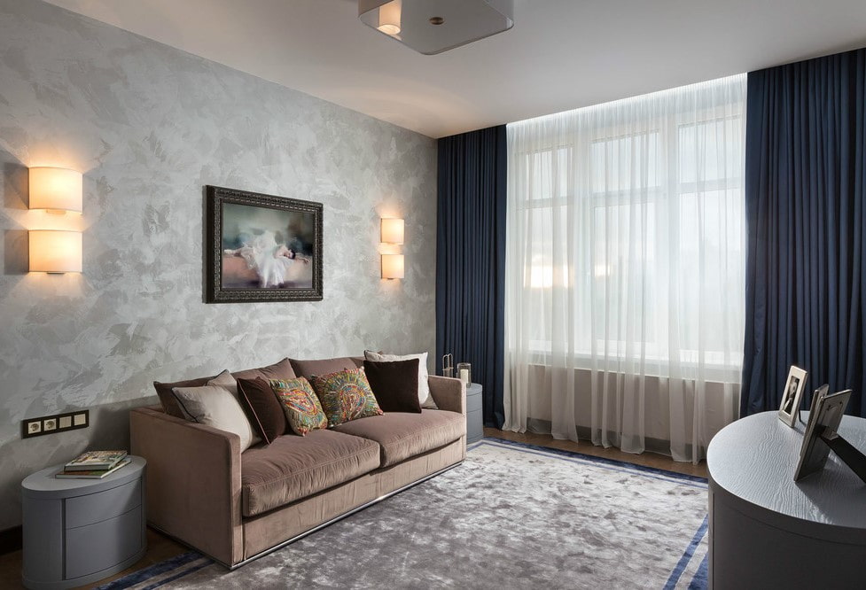 Plastering on the walls or ceiling makes the interior of the living room more luxurious and gives it a visually expensive look. This decorative material, imitating various textures and colors, allows you to make the design of the hall more complete and thoughtful.