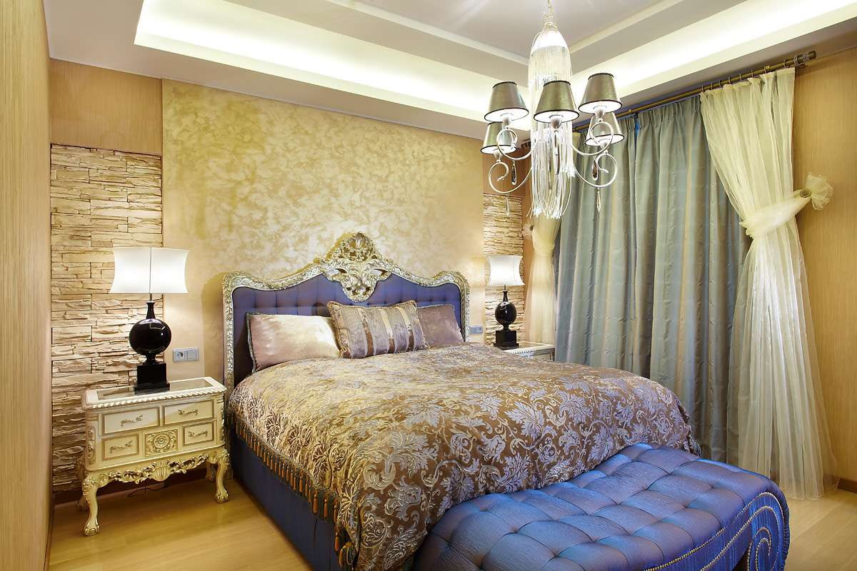 The photo shows a classic bedroom with a ceiling decorated with sand-colored plaster.