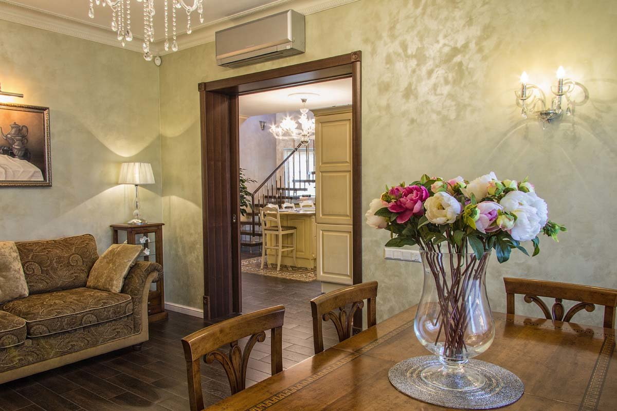 The classic style assumes a neat, symmetrical and proportional design. Decorative plaster in light, as close as possible to natural tones, an elegant smooth silk covering or picturesque panels, frescoes or bas-reliefs with gilding will be appropriate here.