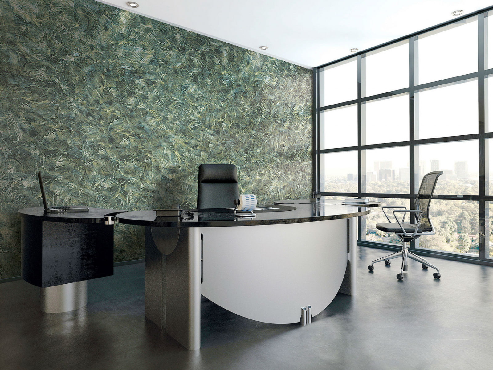 Decorative textured plaster, will give the cabinet originality and sophistication. A multi-layer coating or imitation of marble, granite and onyx will add special respectability to the atmosphere.