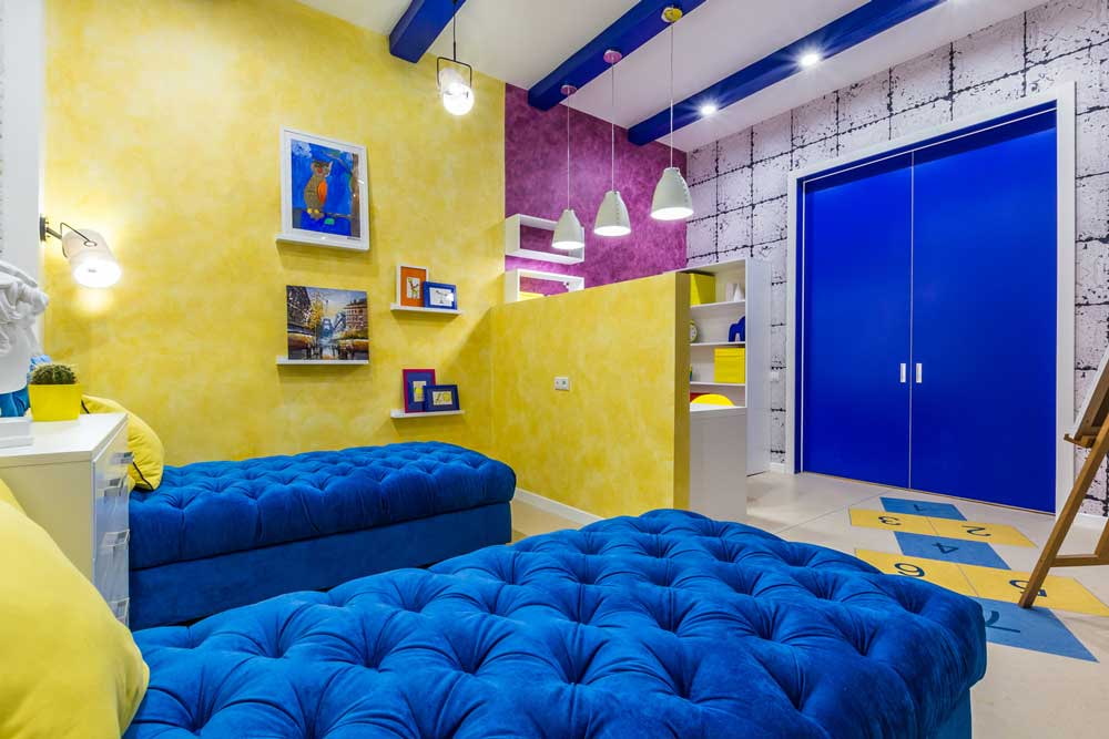 Pictured is a children's room with decorative yellow plaster on the wall.