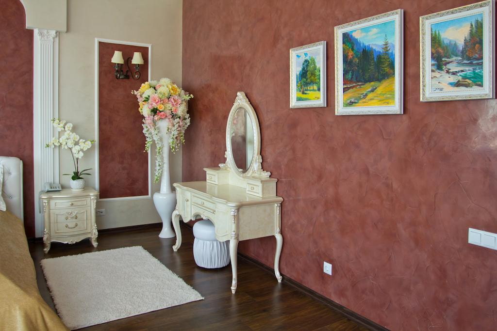 The photo shows decorative beige and brown plaster on the walls and ceiling in the bedroom interior.