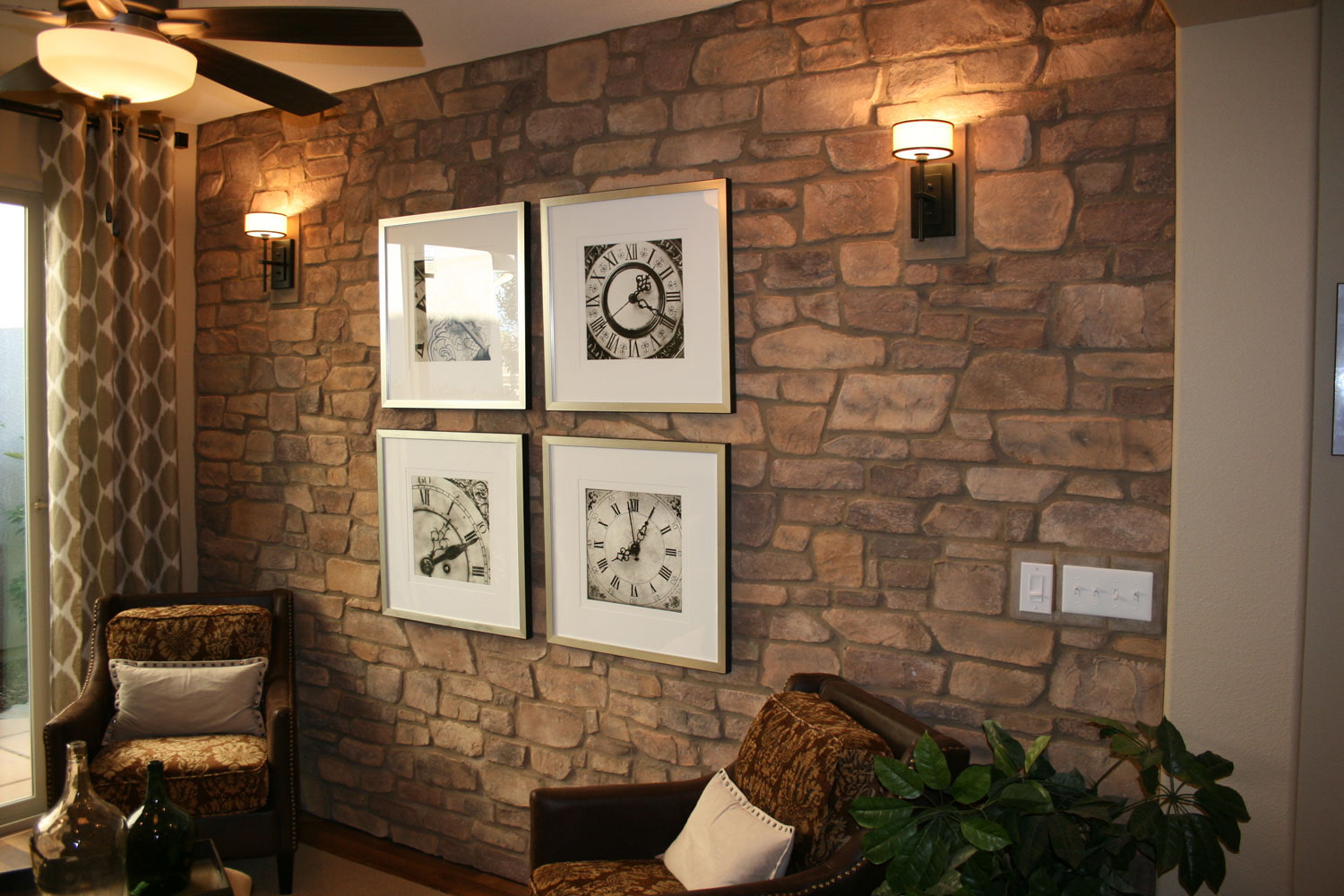 In the photo there is a living room and walls with a decorative coating that imitates masonry.