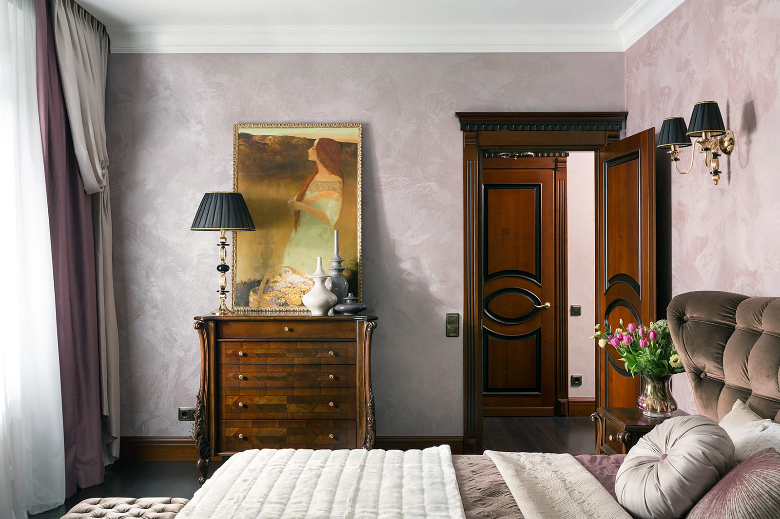 With the help of a subtle pearl shine and gentle overflows, it turns out to create brilliant glossy accents in the room and give it solemnity and a little mystery.