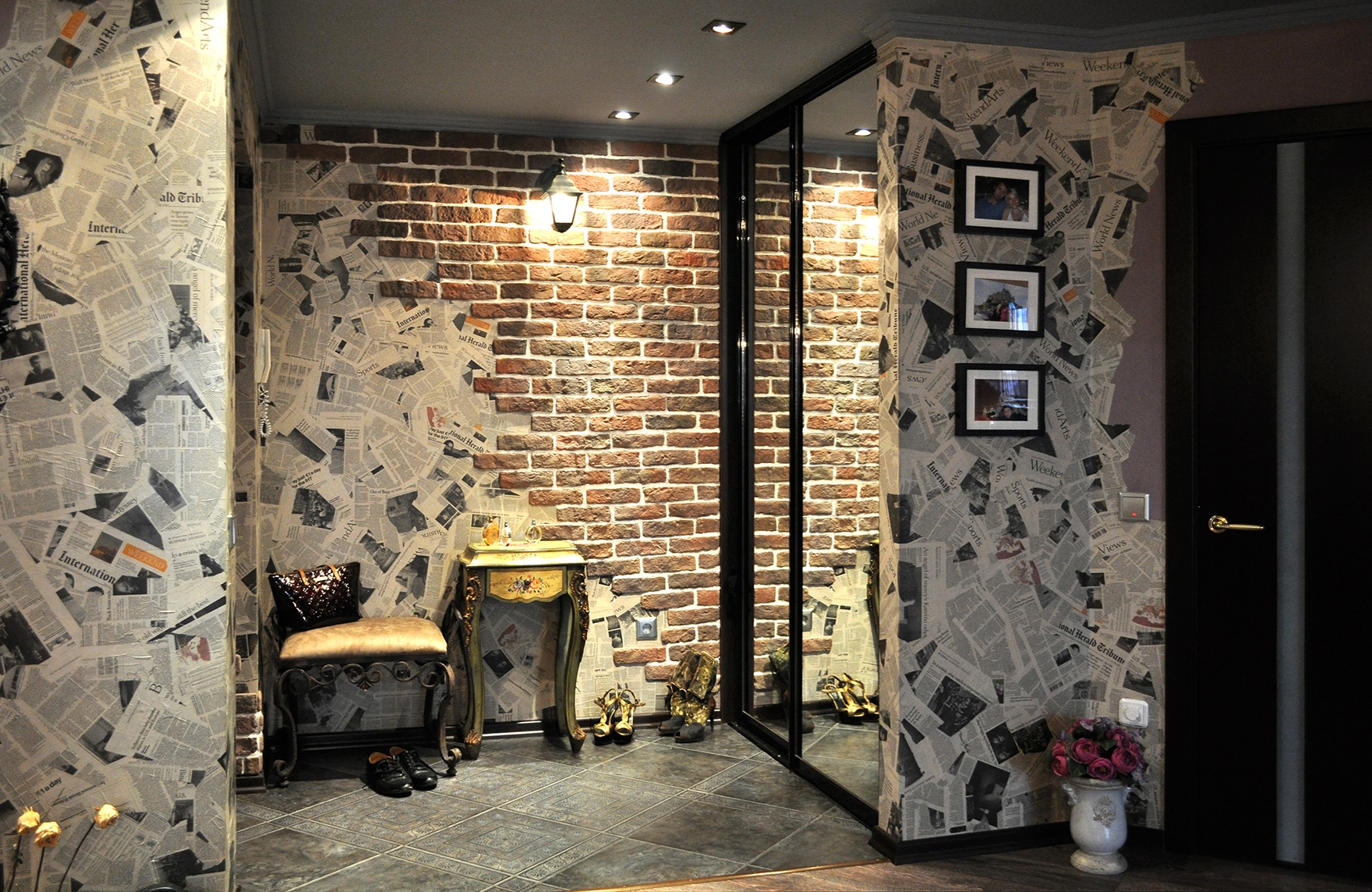 Photo 5. Hallway design. White brick wallpaper will visually expand the hallway area, make it lighter and emphasize the chosen style.