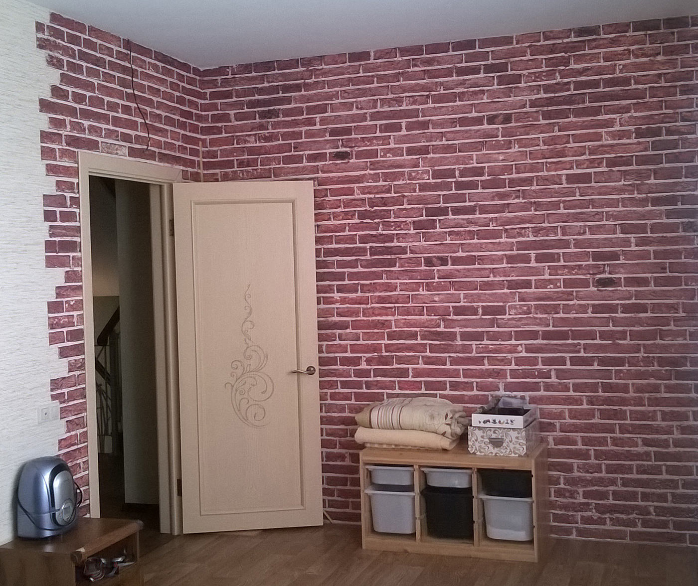 - The brick "cools" the room, because due to the large mass it cannot warm up quickly. Decorative brick wallpaper is devoid of this drawback;