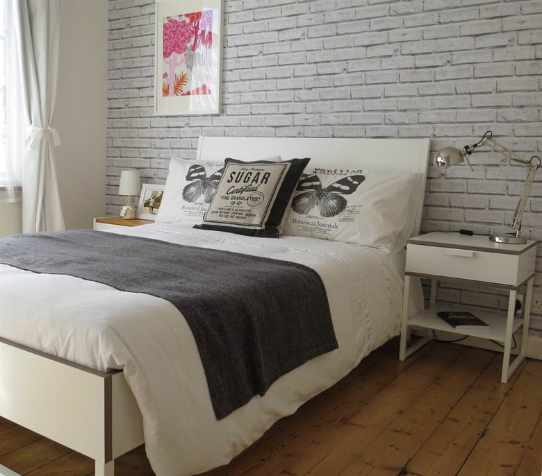 White brick wallpaper.In cases where the area of the apartment is small, the designers use this technique: they trim part of the walls with white-painted brickwork. The texture of the brick gives volume, complicates the space, and the white color expands it. Replacing the facing brick with a brick imitation wallpaper in this case will help to further save precious centimeters while maintaining the visual effect.