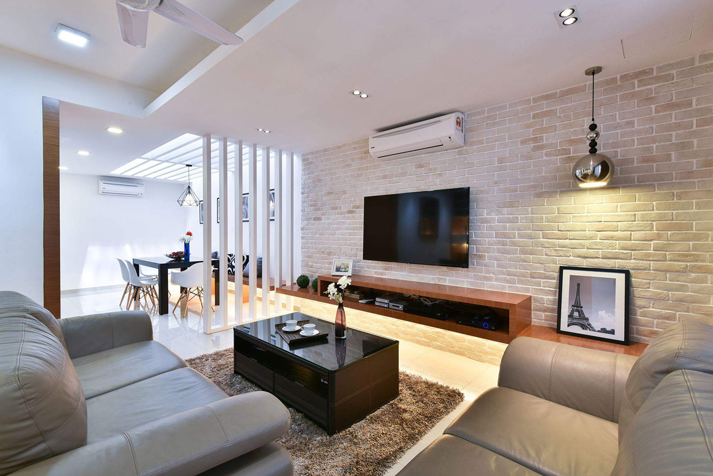 Photo 1. Living room design. Wallpaper with imitation of white or red brick will highlight the working area in the interior of the living room.