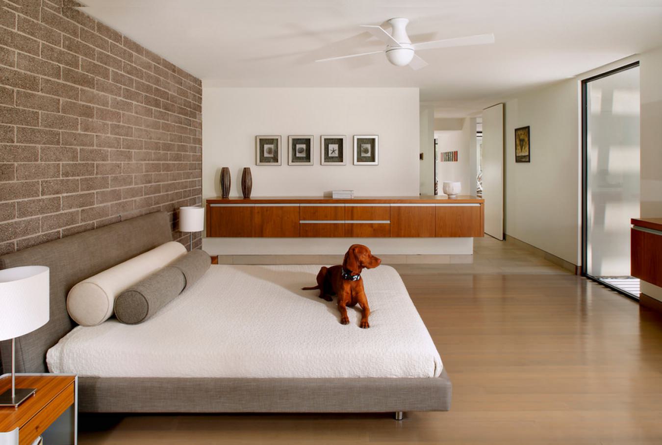 Photo 2. Bedroom design. White brick wallpaper at the head of the wall adds a play of textures, enhancing the decorative effect of the bedroom, decorated in the style of minimalism.