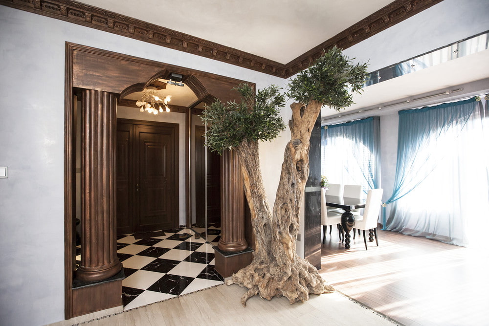 On the picture arch-portal in the interior of the entrance area, made in the colonial style. The dark wood of the portals contrasts with the ivory floor and walls.