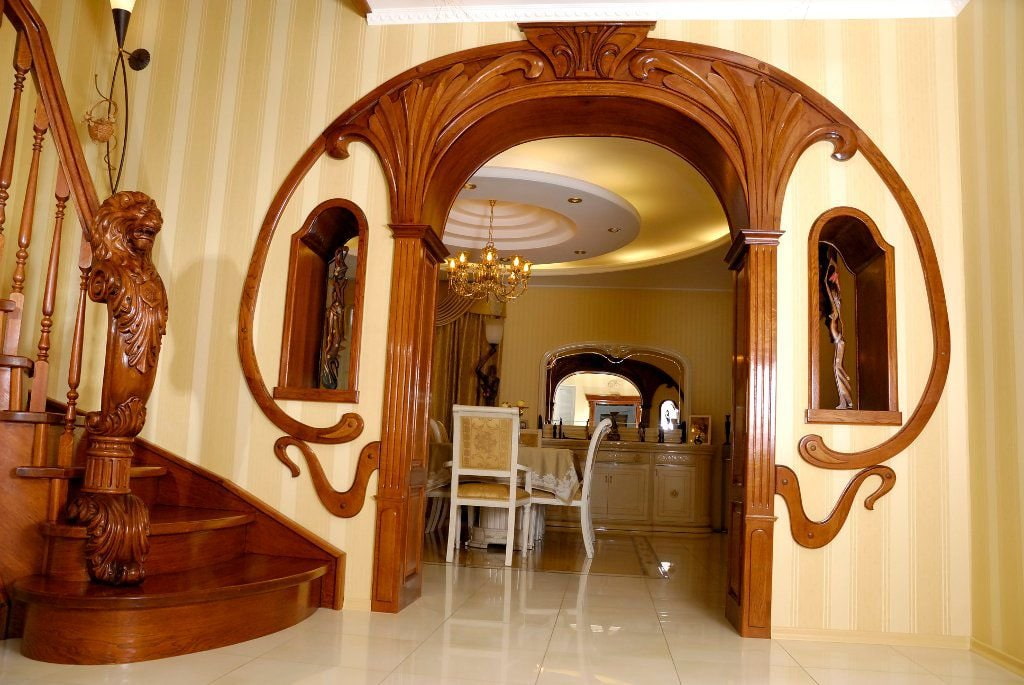 Arch-portal is mounted in doorways of standard rectangular shape. For minimalistic interiors, designers choose unadorned wooden portals. A carved wooden portal looks status and will emphasize the respectability of an office or a country house.
