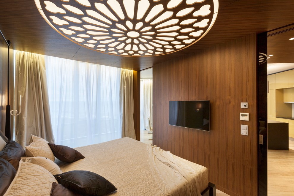 The wooden design of the ceiling plane will make the bedroom much more comfortable and add an atmosphere of intimacy and a certain charm to it.