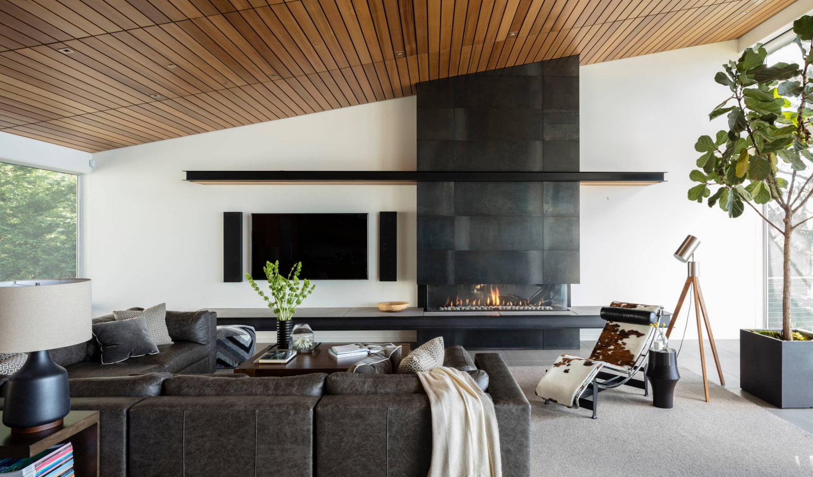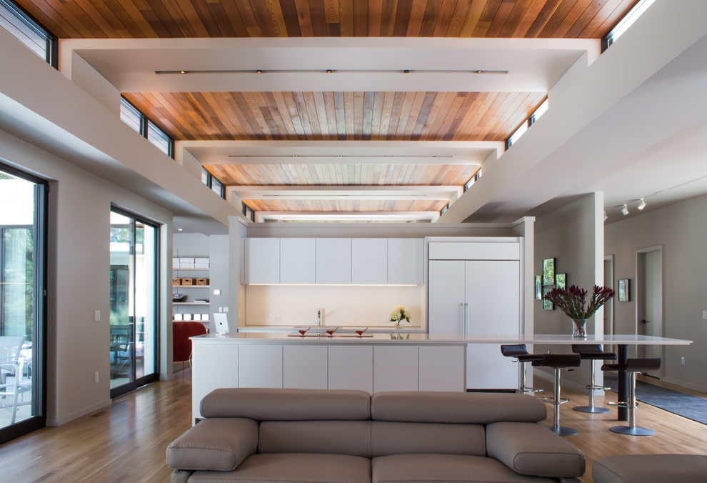 Such ceilings will add even more space, air and light to the modern style, and emphasize its unique and distinctive character.