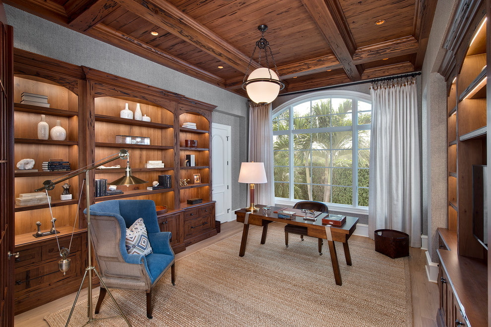 In the photo is an office with a dark-colored wooden coffered ceiling.